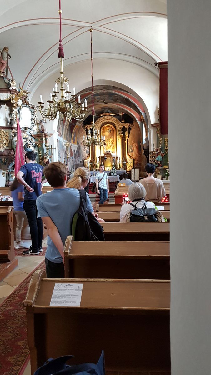 Áhítattal figyeltük a Keresztelő Szent János templom barokk belsőterét, majd hallgattuk történetét. (fotó: Juhász Zoltán)