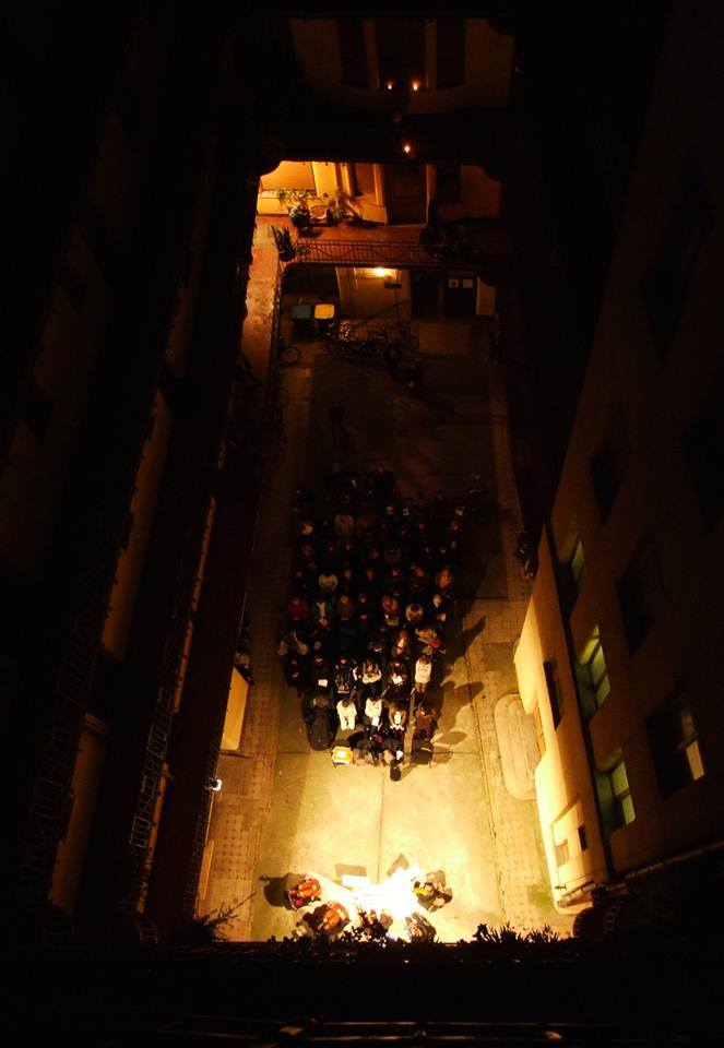 A didergető, szeles őszbe hajló időben egy remek programra kaptam meghívást. A Pecz Samu-féle református templom mögötti 100 éves budai polgári bérházban Sugár Péter és Baranyai Katalin ismét megszervezte éves udvarkoncertjüket. Csonka Zsófival átbújtunk a kovácsolt kapun, s megpillantottuk az egyébként csendes udvart – melyet kerékpárok lelakatolására, és a hetenkénti kukák tisztítására használnak – amely most csodás fényárban úszott, kölcsönvett székek népesítették be, s egy tucat érdeklődő pokrócokba bugyolálva ült, várva a hangok felcsendülését. Mi Zsófival egyenesen a 6. emeletre lépcsőztünk, mivel Katalin tanárnőék jó házigazda módjára sok tepsi pogácsával, s zsíros kenyérrel készültek, amit Sugár Simonhoz társulva a pöttöm liftben Laokoón-csoport módjára összezsúfolva szerencsésen lejuttattunk a vendégekhez.